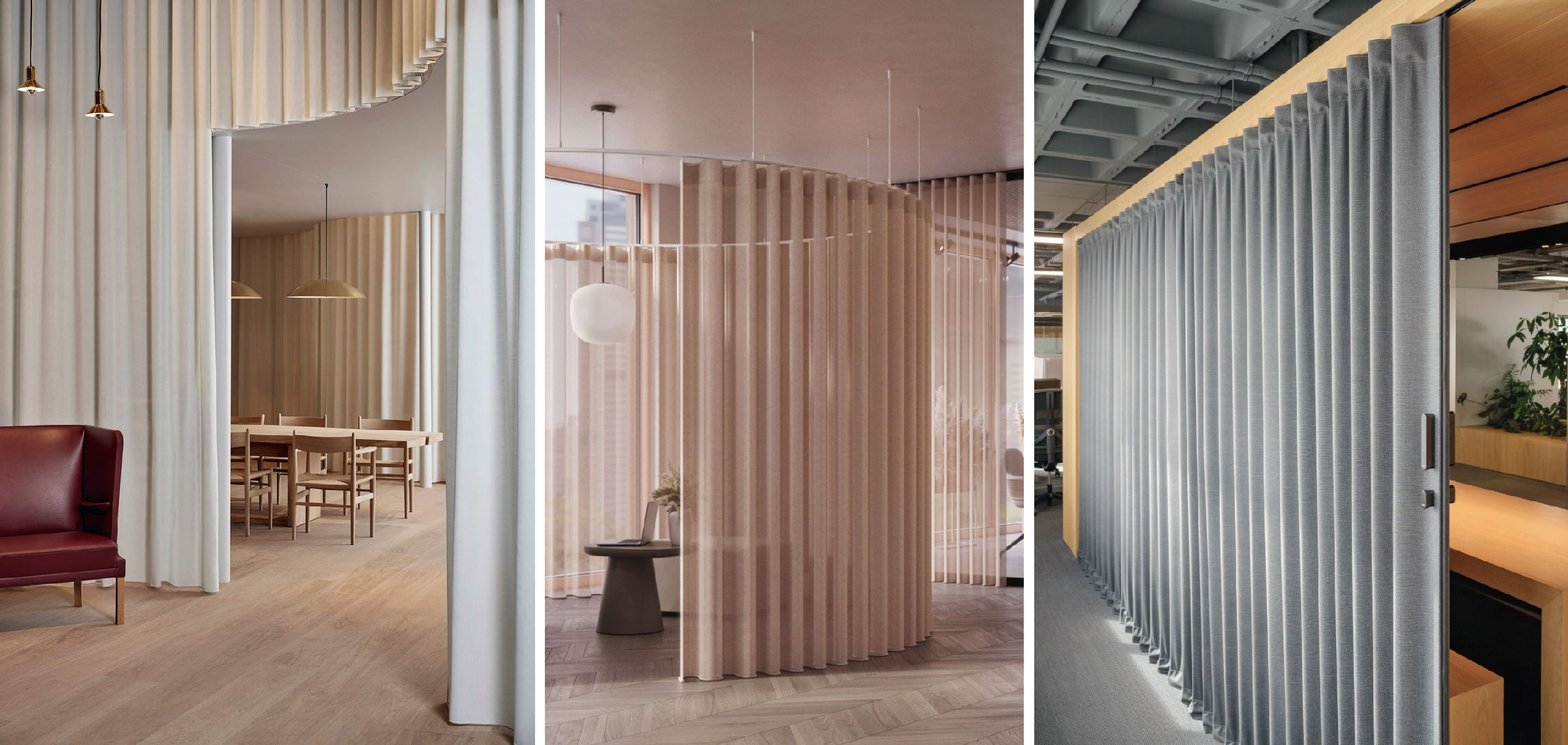 Локализация и зонирование звука — текстильные перегородки и панели создают гибкость эксплуатации и управления без капитальной реконструкции. Это удобно для open-space офисов и общественных пространств, где необходимо выделить рабочие зоны. Текстильное зонирование — популярный приём, используемый в коммерческих помещениях.