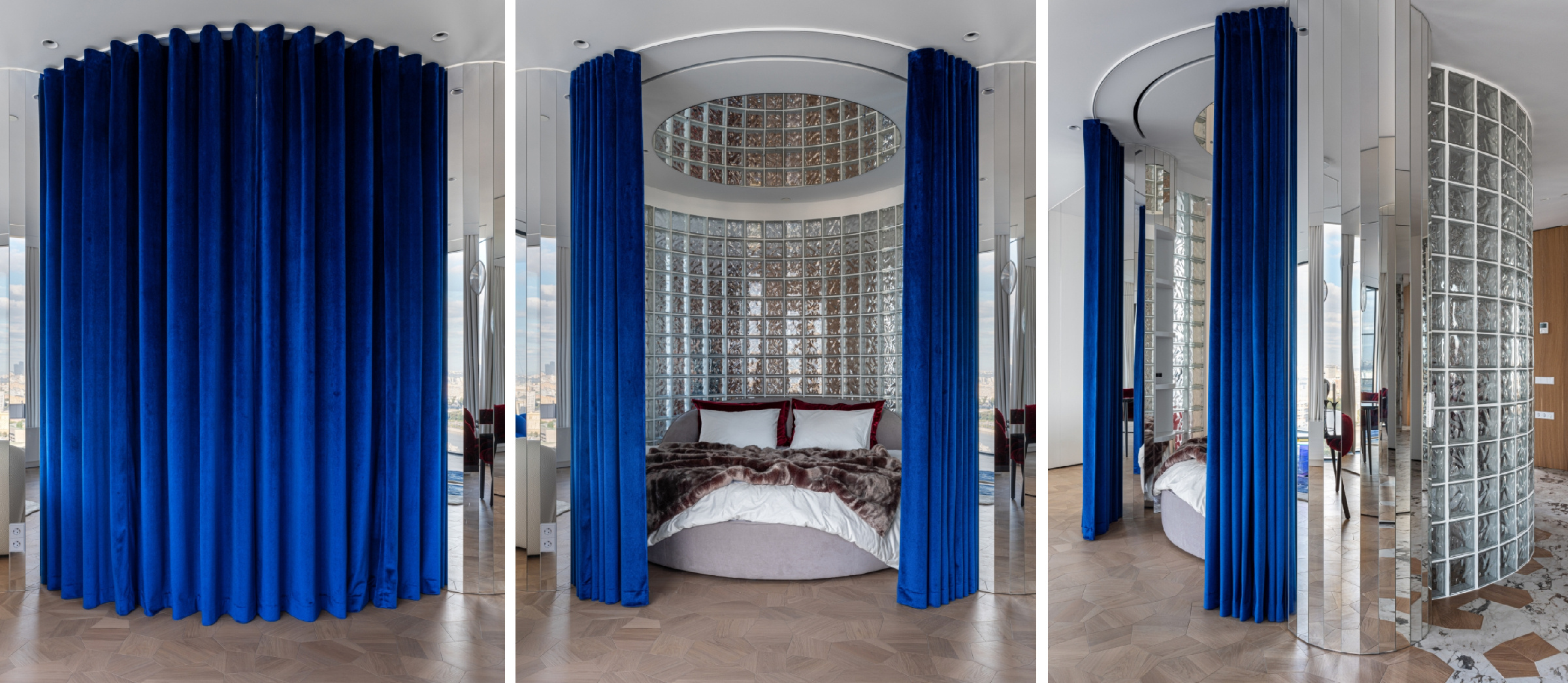 Текстильное зонирование с использованием бархатных портьер Decortier, изготовленных для проекта дизайнера Ирины Чернейкиной. Фото: Антон Лихтарович.