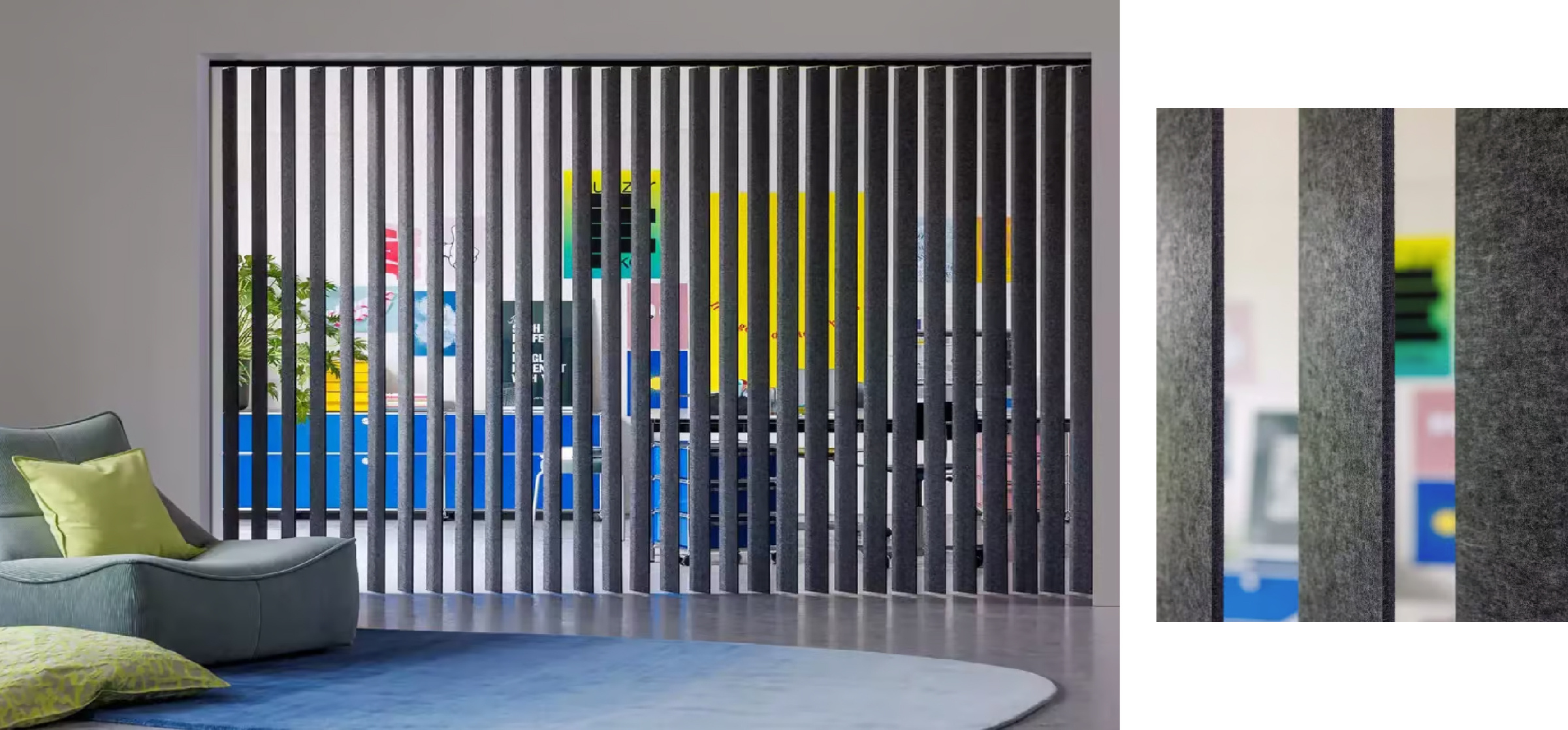 Акустические вертикальные жалюзи из 100% огнестойкого полиэстера. Création Baumann Acoustic Stripes.