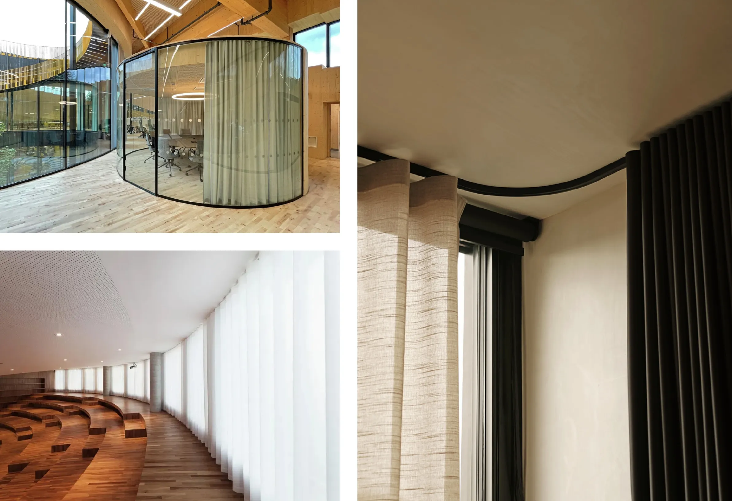 • Эстетика и практичность — мотор скрыт в карнизе, а ткани могут быть любыми — от лёгкой вуали до плотного блэкаута. Сочетание нескольких линий навесок с гибким управлением делает использование систем удобным и комфортным каждый день.