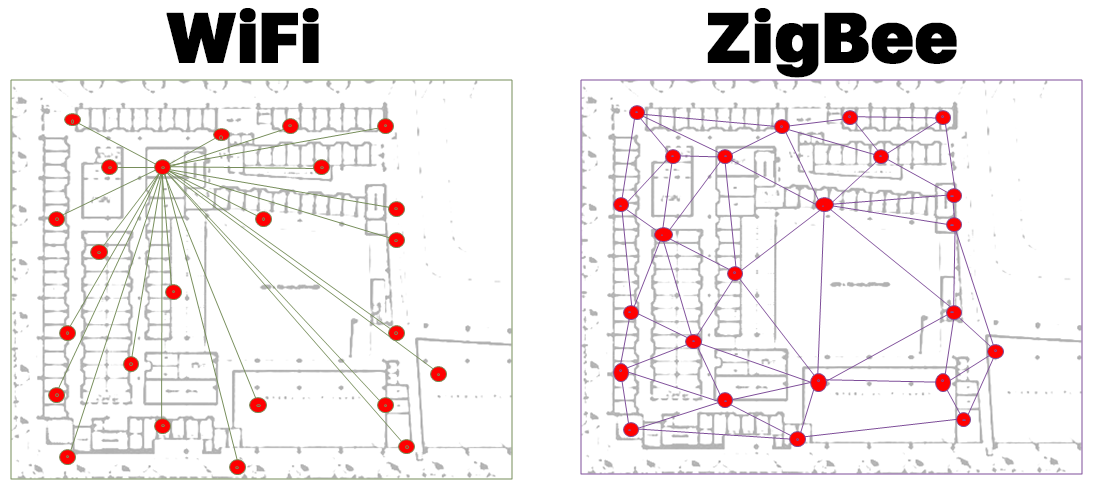 Преимущества: низкое энергопотребление, высокая скорость передачи данных, возможность формирования собственной сети (mesh-сеть), где каждое устройство ретранслирует сигнал, обеспечивая большую дальность и надёжность связи.
