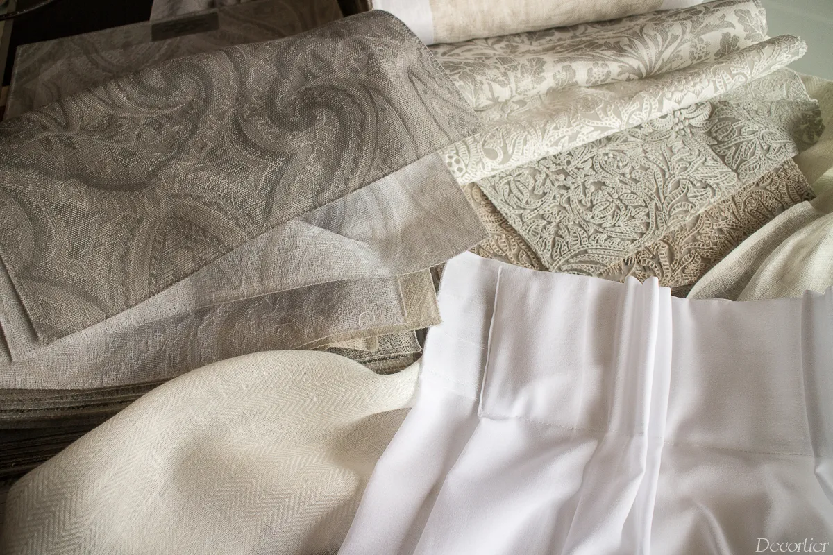 Начнем с классического варианта, когда в традиционный интерьер хочется добавить многослойности и драпировок. Сюда идеально подойдут ткани с филигранной вышивкой от Morris&Co на тонком шелке, льне, а также полупрозрачные принты на льне.