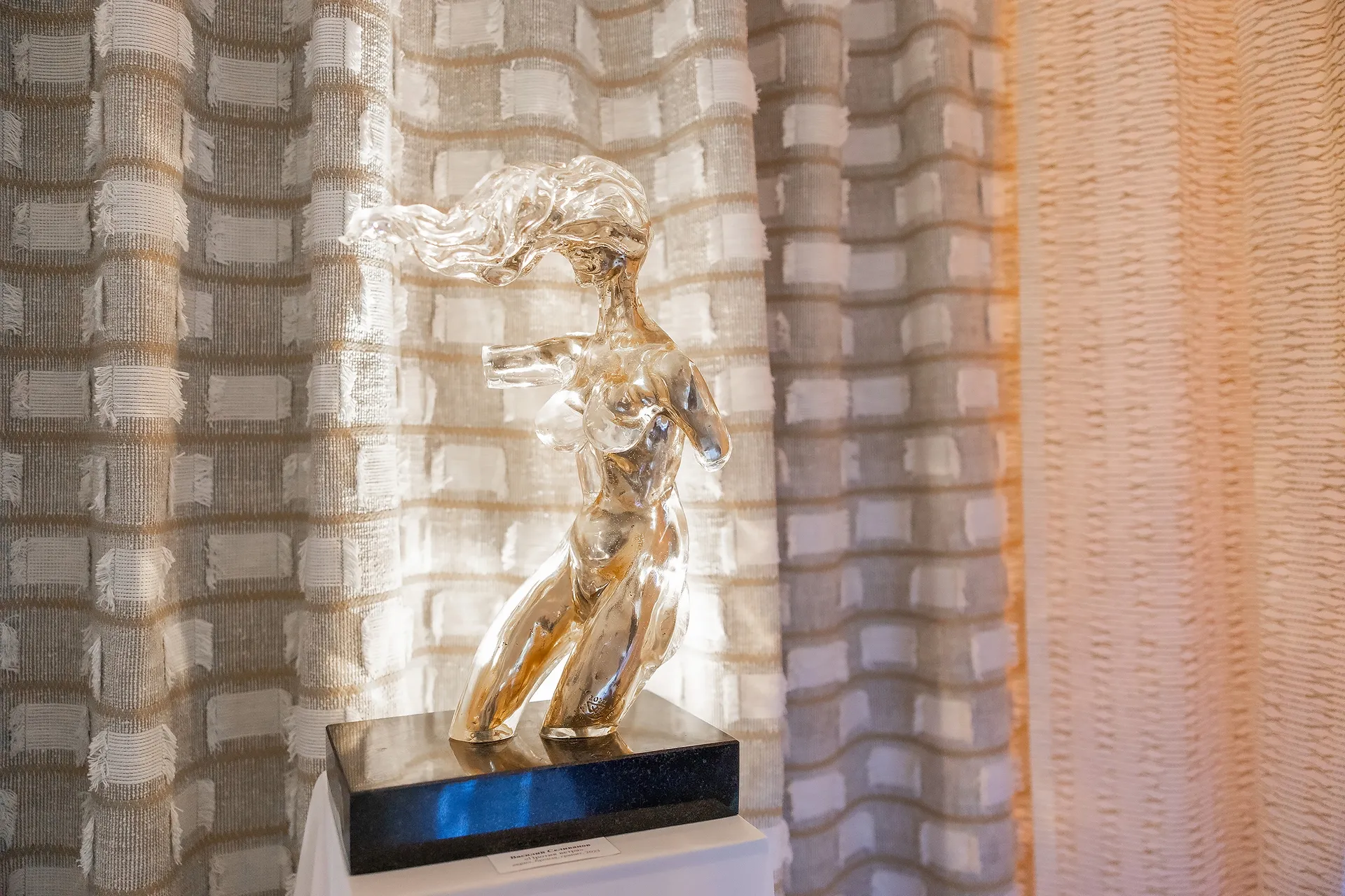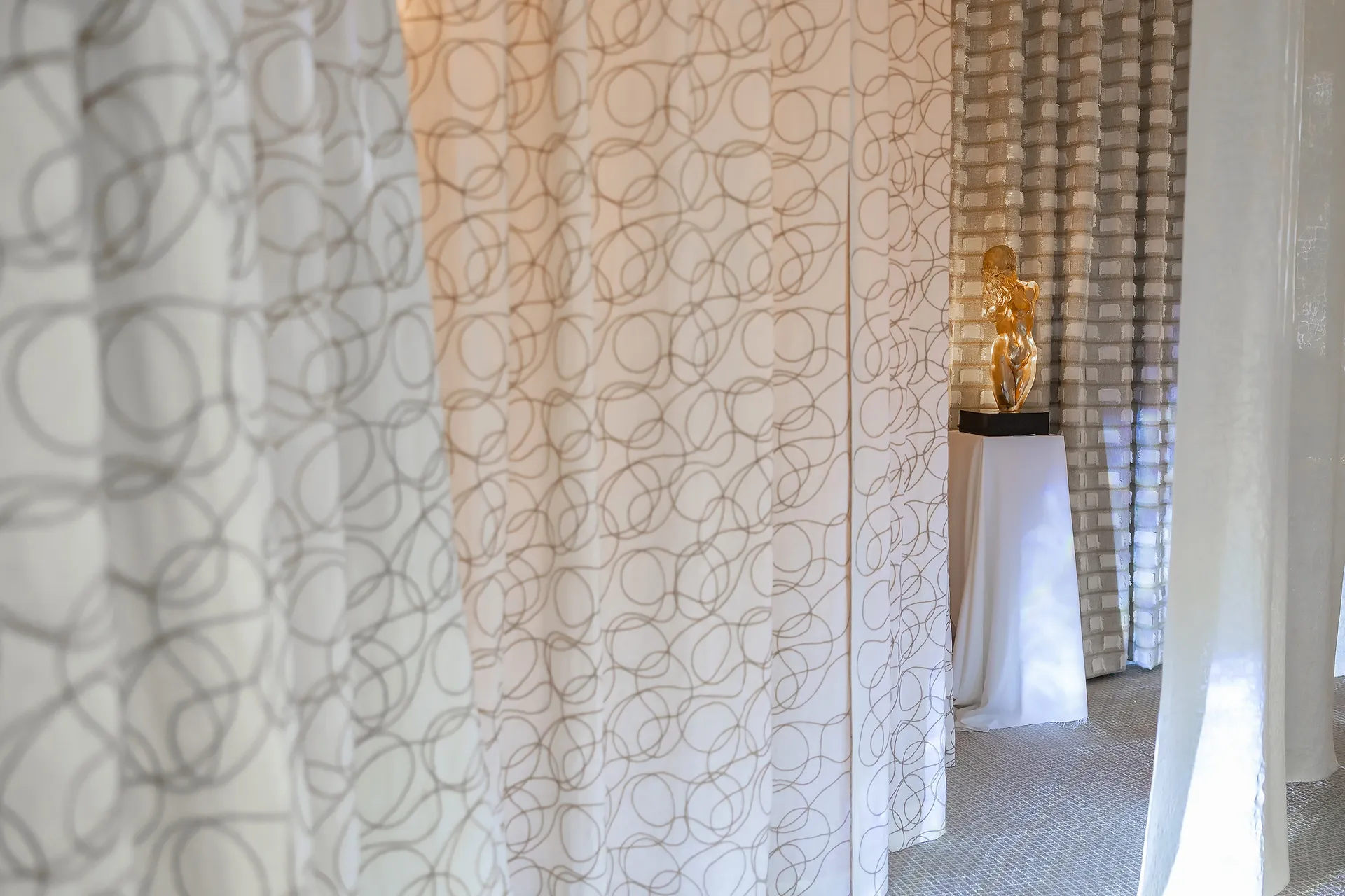 Из мебели у нас был диван, обитый золотой тканью, и консоль, обитая букле. Правую переговорку отделяла жёсткая ткань с горизонтальной полоской. Мы сделали мягкий нижний подворот и внизу распустили бахрому, по краям сделали два варианта: с репсовой лентой контрастного цвета и выпуском бахромы, и просто в подворот, без контрастной ленты и выпускаИз мебели у нас был диван, обитый золотой тканью, и консоль, обитая букле. Правую переговорку отделяла жёсткая ткань с горизонтальной полоской. Мы сделали мягкий нижний подворот и внизу распустили бахрому, по краям сделали два варианта: с репсовой лентой контрастного цвета и выпуском бахромы и просто в подворот, без контрастной ленты и выпуском бахромы. Изделие на центральном полукруге было обработано просто: подворот припущен на пол. Еще была ячеистая сетка, которую мы использовали поперек, потому что она очень хорошо гнётся по вертикали, а по горизонтали — плохо. Так как ширина этой ткани 1,3 м, нам нужно было сделать горизонтальные швы, чтобы добрать высоту. Мы обработали этот горизонтальный шов, сделали в припуск и тоже разбахромили, получился такой интересный кант из бахромы на месте стыка. Была ткань на шерстяной основе, такой полимер с гипсом, которая очень круто смотрелась на просвет. Мы обрезали технический край ткани по кругу и из него сделали окантовку по периметру, таким образом придав законченный вид. Был лён бельгийский с джутовой вышивкой. Мы по низу отпороли эту вышивку, сделали мягкий подворот, а в вертикальный край вставили кантик из пробки, который очень хорошо сочетался с джутовой вышивкой, держал край и придавал законченный вид. А чтобы прикрыть сами стены, мы использовали плотные шторы. Все эти ткани полупрозрачные, что давало впечатление не закрытого павильона, а создавало некий интим и загадочность. Между полотнами стояли включенные проекторы, и через ткани проходил свет, создавая некую магию. бахромы. Изделие на центральном полукруге было обработано просто — подворот припущен на пол. Еще была ячеистая сетка, которую мы использовали поперек, потому что она очень хорошо гнётся по вертикали, а по горизонтали — плохо. Так как ширина этой ткани 1.3 м, нам нужно было сделать горизонтальные швы, чтобы добрать высоту. Мы обработали этот горизонтальный шов, сделали в припуск, и тоже разбахромили, получился такой интересный кант из бахромы на месте стыка. Была ткань на шерстяной основе, такой полимер с гипсом, которая очень круто смотрелась на просвет. Мы обрезали технический край ткани по кругу, и из него сделали окантовку по периметру, таким образом придав законченный вид. Был лён бельгийский с джутовой вышивкой. Мы по низу отпороли эту вышивку, сделали мягкий подворот, а в вертикальный край вставили кантик из пробки, который очень хорошо сочетался с джутовой вышивкой, держал край и придавал законченный вид. А чтобы прикрыть сами стены мы использовали плотные шторы. Все эти ткани полупрозрачные, что давало впечатление не закрытого павильона, а создавало некий интим и загадочность. Между полотнами стояли включенные проекторы, и через ткани проходил свет, создавая некую магию.