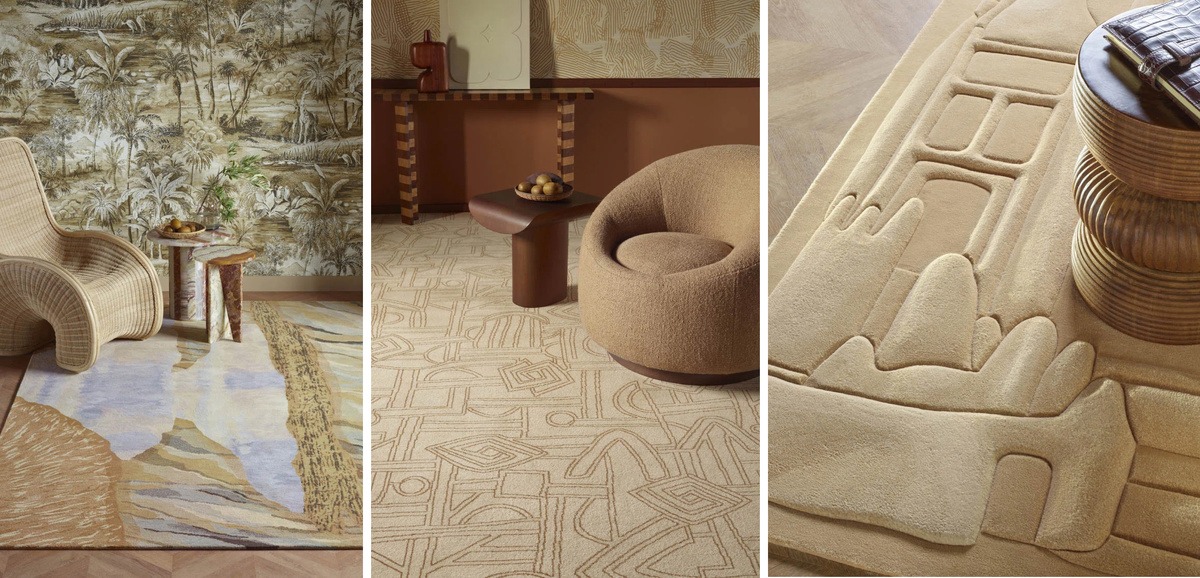 Ковровые покрытия поддерживают ту же эстетическую систему. В них наиболее отчётливо ощущается ритм пустыни — через ворс, через плавные переходы цвета и мягкую геометрию. Ковровая линия коллекции Deserts построена на нескольких производственных технологиях: ручной тафтинг (hand-tufted), традиционное узелковое ткачество (traditional knotted techniques) и машинная ткацкая техника Axminster. Такое разнообразие техник и возможностей позволяет создать изделия под любые декоративные и эксплуатационные условия.