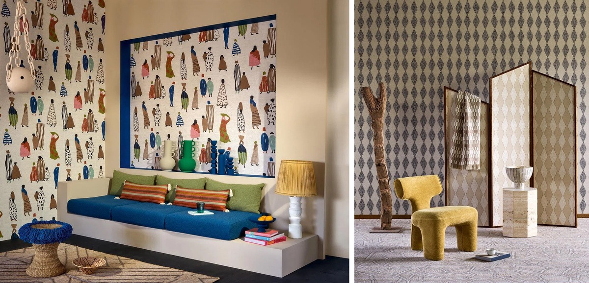 Полотна Deserts работают на границе рисунка и фактуры. Pierre Frey часто использует приём, когда обои становятся частью материальной среды. Здесь этот эффект достигается мягкой графикой — крупными линиями, абстрактными структурами, которые напоминают ландшафтные формы: дюны, волны, плоскости, размытые границы света и даже фигуры людей.
