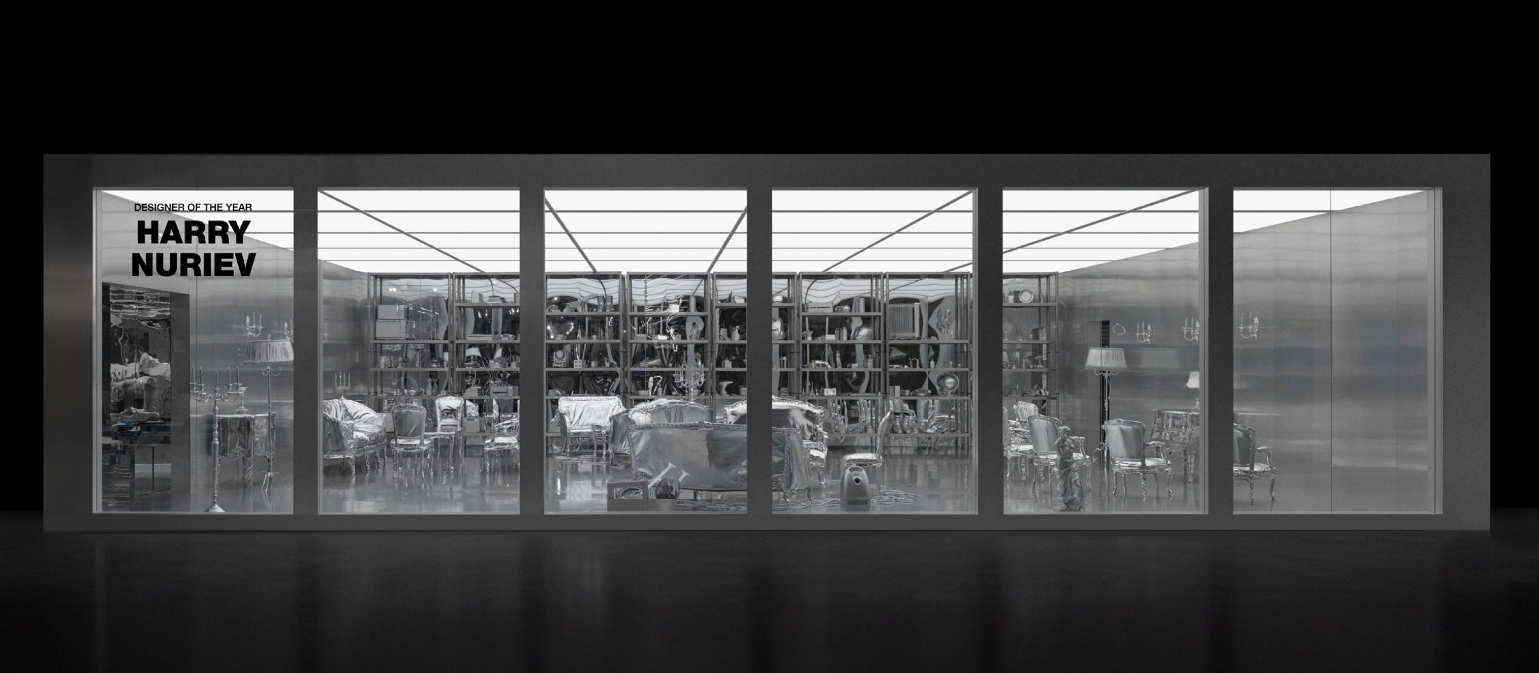 Концепция и визуал: Нуриев создал пространство, напоминающее стерильную лабораторию или футуристический бункер. В центре внимания — классическая, даже помпезная мебель, которая была полностью «одета» в серебряную металлизированную ткань или покрыта слоем серебра. Наряду с ней на стеллажах можно заметить и объекты из эпохи 90-х, и даже современные бытовые артефакты — принтер, пылесос и даже пульверизатор.