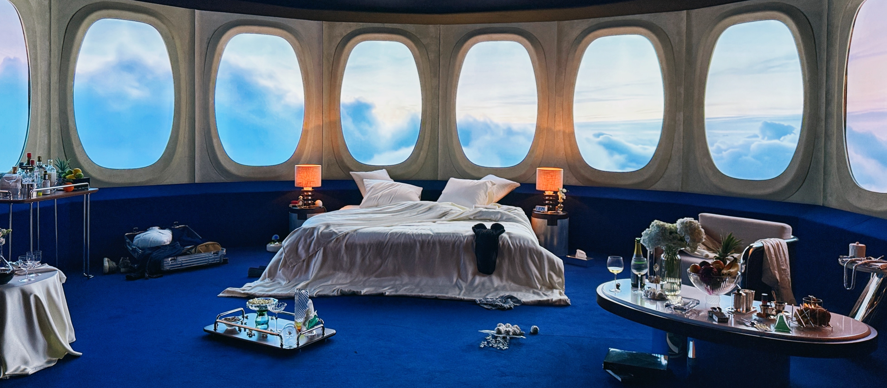 Оформление: пространство напоминало каюту океанского лайнера 1930-х годов или салон футуристического дирижабля. Главный элемент — большие окна-иллюминаторы, за которыми транслировалось бескрайнее небо с облаками.