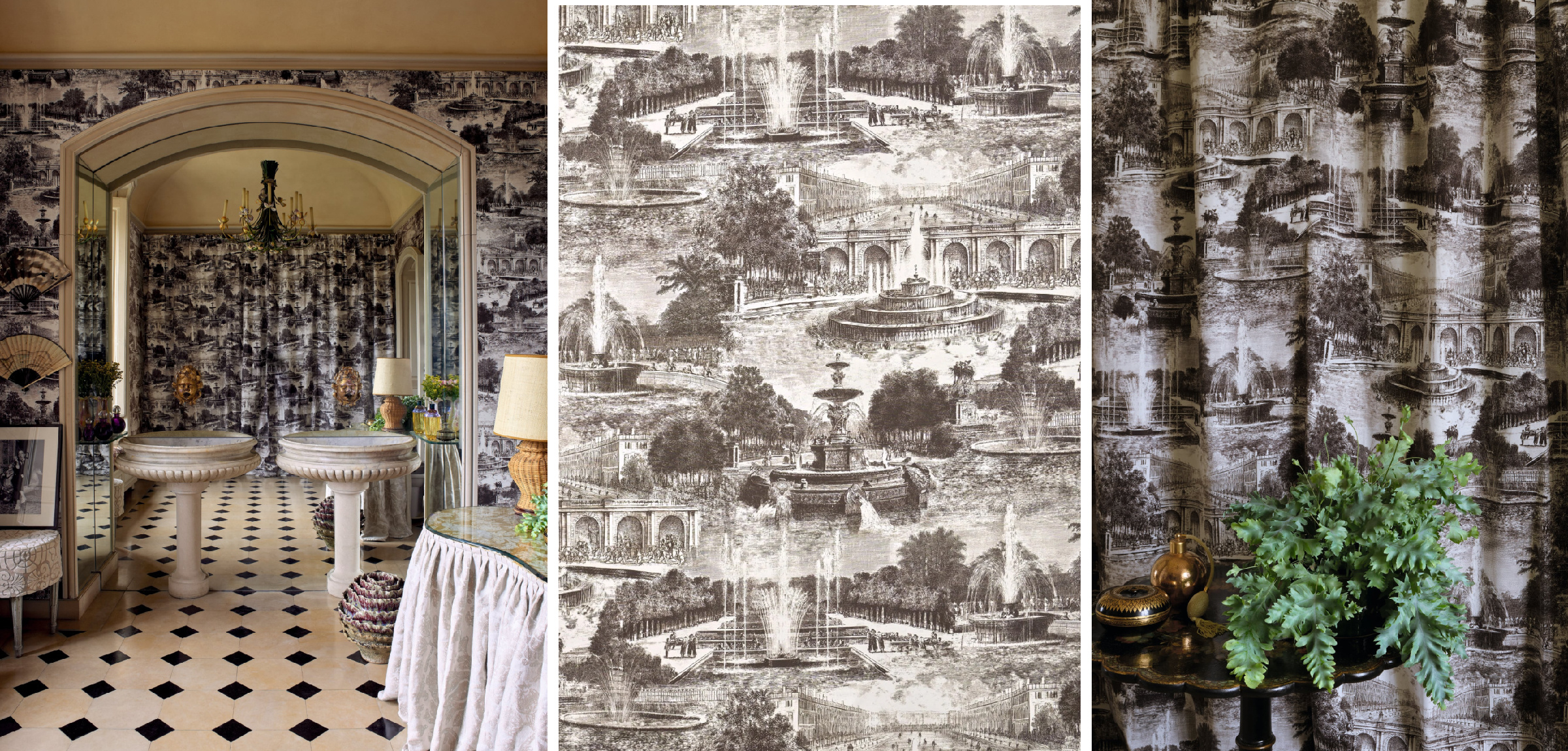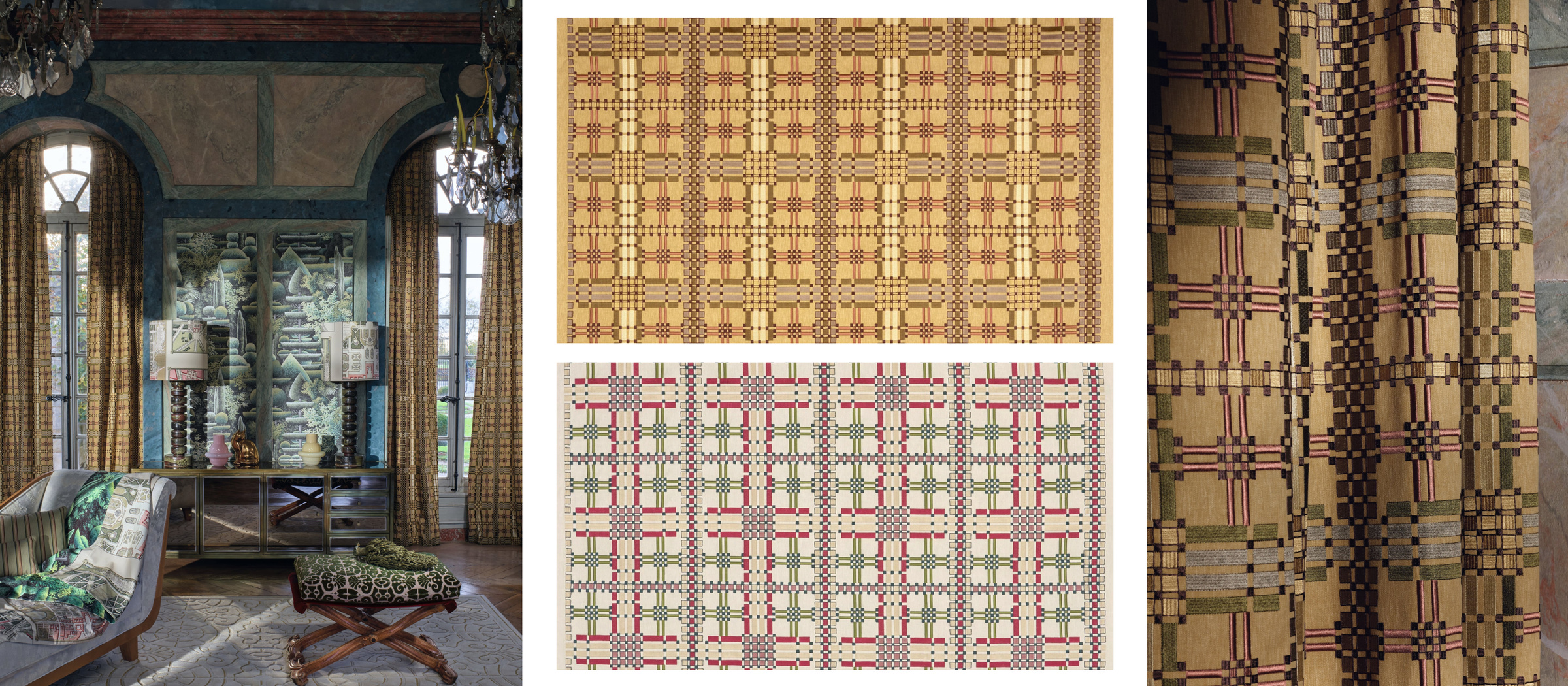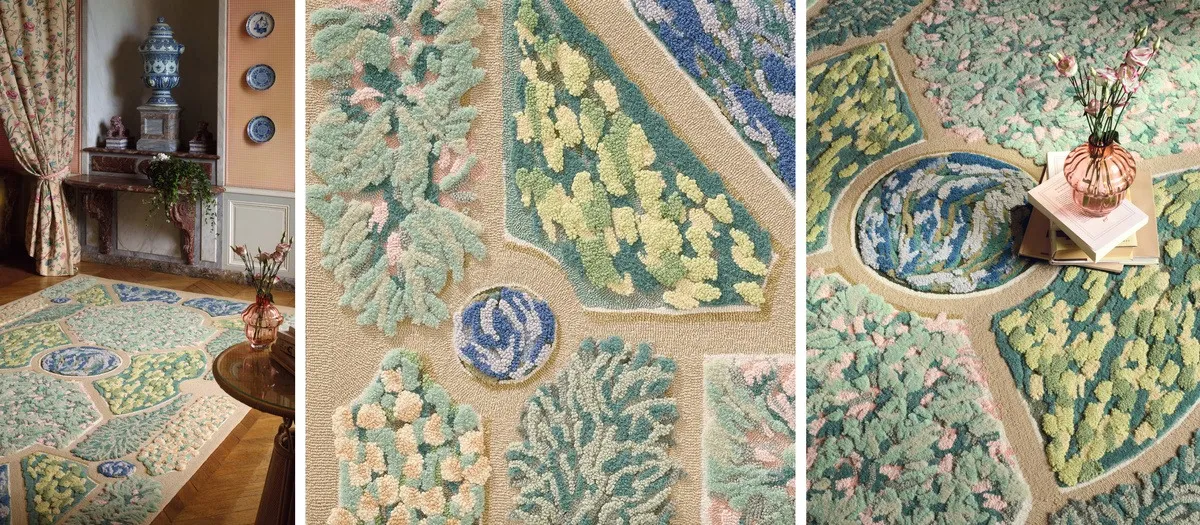 Здесь повторяется та же логика, что из тканями: много растительных мотивов соседствует с геометрическими элементами и смелыми панно с архитектурными элементами, изображающими центральную перспективу регулярного парка. Крупнораппортные обои открывают ту эпоху с особой монументальностью и роскошью. Здесь же появляются и гобелены XVII и XVIII веков, и вдохновение классикой Toile de Jouy, и искусно вышитые полотна из соломы и сизаля, и даже чертежи оранжерей.