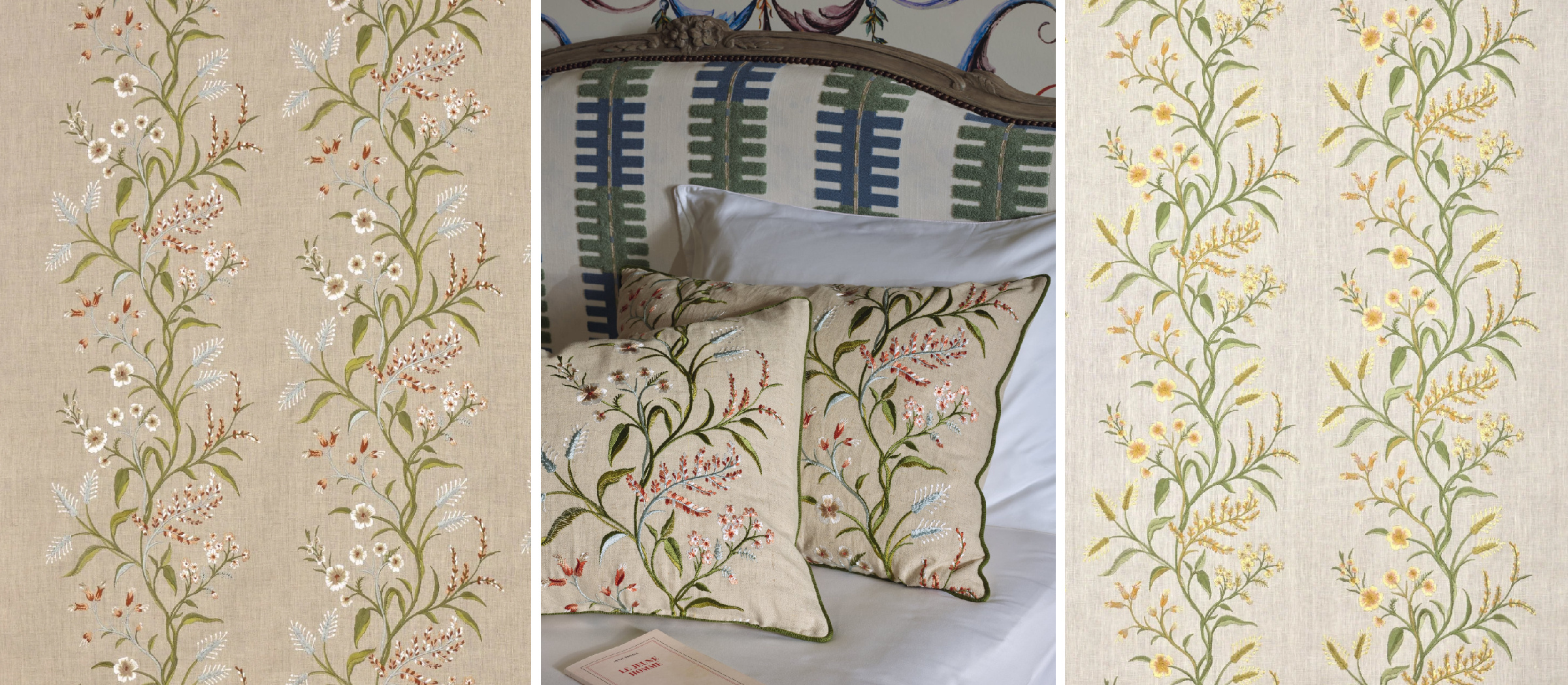Вышивки с растительными элементами — решение, которое может наполнить интерьер жизнью. Фантастическая детализация в сочетании с натуральными волокнами в составе. Вышитые элементы подчёркивают уникальность природных фактур: листьев и цветов, крон деревьев. Многообразие оттенков и поистине много красок делают этот релиз особенно ярким.