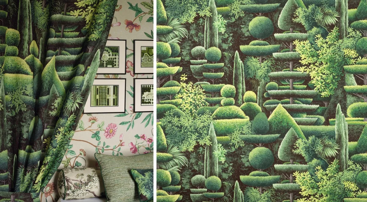 Здесь доминирует идея укрощённой природы, выраженной в придании растениям строгой «геометрической строгости, формального совершенства», как указано в брошюре фабрики. Благородная зелень садов вписана в различные материалы, каждый из которых по-особенному раскрывает замысел коллекции. Приводим несколько примеров, иллюстрирующих это направление в релизе.