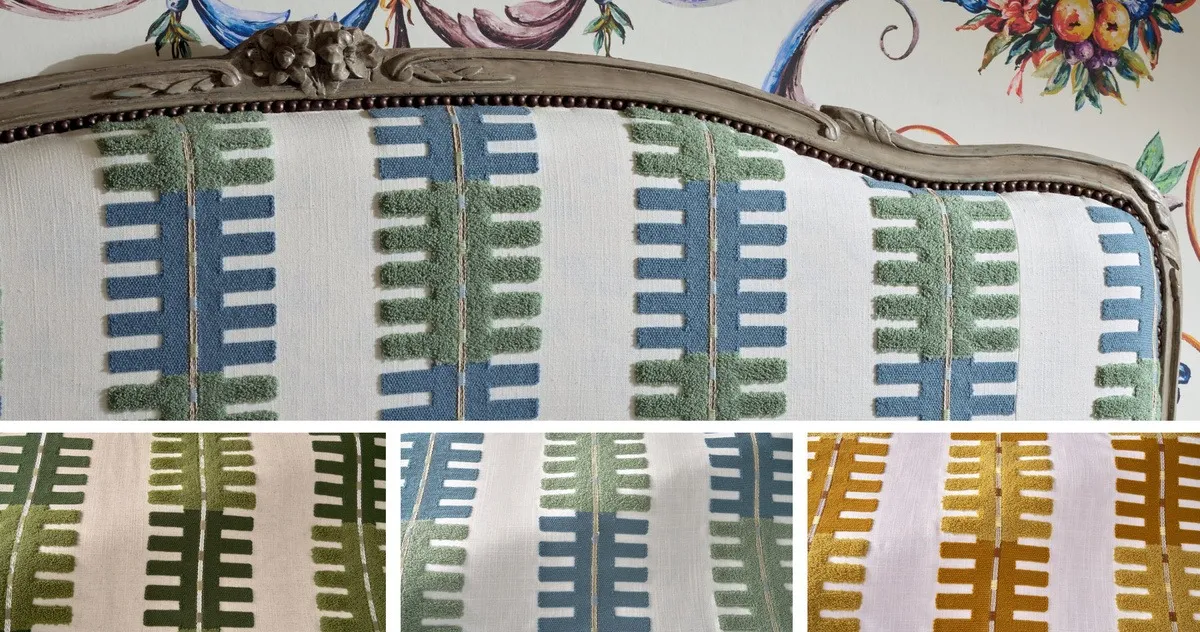 Ussé — вдохновлённая геометрией французских парадных садов, эта крупная многоцветная клетчатая вышивка на хлопке доступна в осенних и весенних оттенках. Вдобавок к клетке в коллекции представлена ткань Rayure anjou — роскошное полосатое дополнение с шерстью в составе.