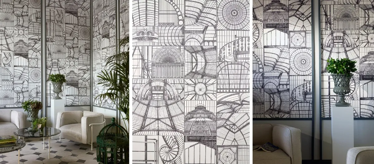 Sous la verriere — тщательно выполненный рисунок Люсиль Клерк напечатан на обоях с широким раппортом на глянцевой нетканой основе. Он изображает стеклянные крыши различных известных садовых оранжерей. Архитектура переосмыслена в виде сетки, что придаёт стене графичный и элегантный эффект.