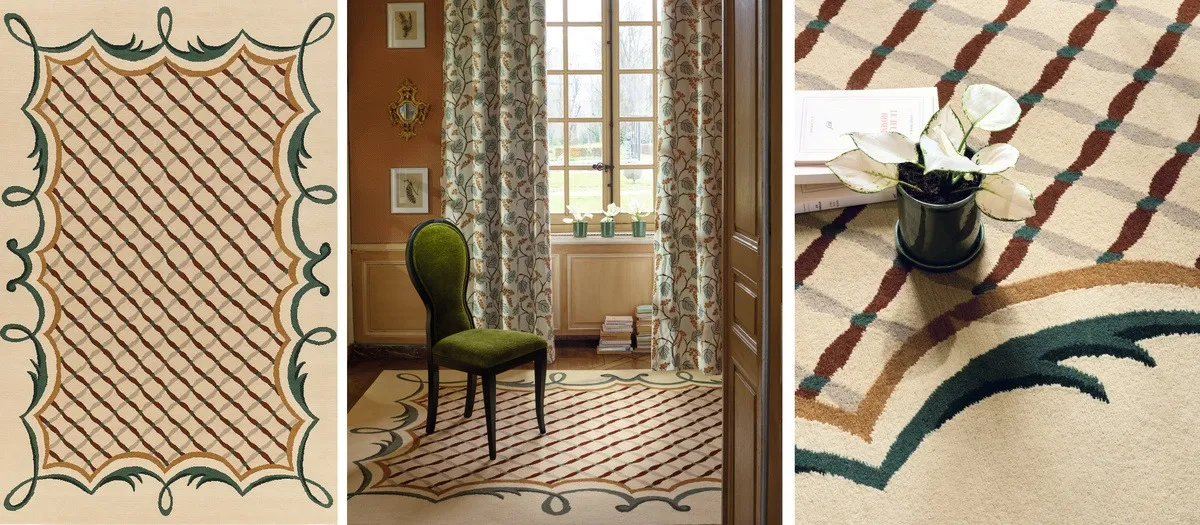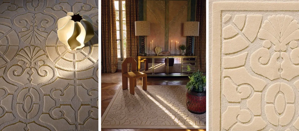 Ковры ручной работы с рельефной вышивкой (Aubelles, Athenaïs) требуют предельно деликатного обращения. Важное правило: не ставьте на такие рельефные ковры тяжёлую корпусную мебель (шкафы, комоды на ножках), вы рискуете навсегда замять скульптурный ворс. Такие ковры должны лежать в центре композиции, солируя в интерьере.