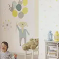 Белые бумажные обои с мелким желто-белым рисунком в виде облаков дополнит панно с крупным зайцем и воздушными шариками в той же цветовой гамме. |