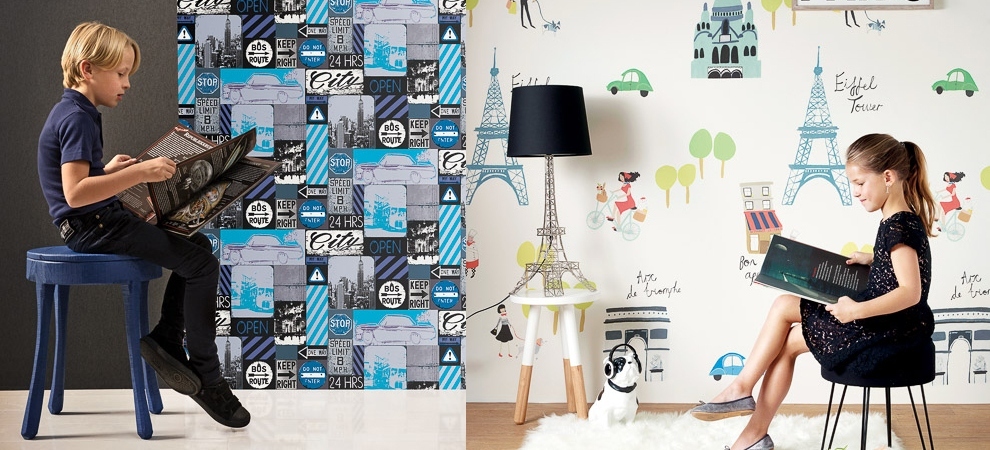 Для ребят постарше – парижские зарисовки, наборы открыток, пышные цветочные дизайны с индийскими нотками. Сочная палитра и симпатичные орнаменты на полотнах создают позитивное настроение в комнате, разбавляя будние дни яркими красками. Все панно коллекции выполнены из моющегося винила, поэтому можно не бояться случайных пятен в детской комнате. А родителям понравится демократичная цена детских обоев этой коллекции.