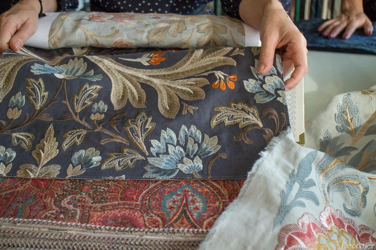 В осенней коллекции Colefax&Fowler присутствует огромное количество великолепных вышивок. Много трендовых оттенков охры и синего.