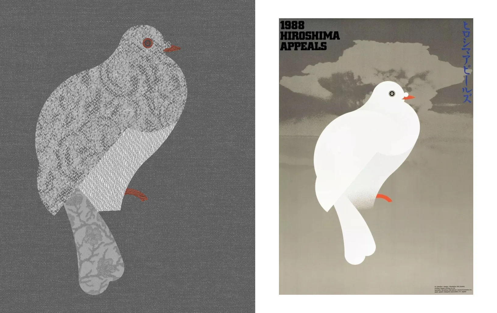 Основой для коллажа является плакат графического дизайнера Икко Танака из проекта, посвящённого памяти жертв атомной бомбардировки Хиросимы, 1988 год. Спинка и крылышко голубя выполнены из ткани Ardecora, коллекция Sentieri di Seta. Хвост, грудка, клюв, лапка и фон — всё из новой коллекции Blooming Hills от Zimmer + Rohde.
