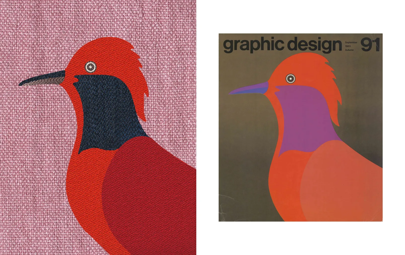 Основой является иллюстрация Рёхэя Кодзимы для обложки 91-го номера японского журнала Graphic Design, вышедшего в 1983 году. Для фона использована льняная ткань, а для тёмно-синей шейки и клюва — жаккард, обе ткани из каталога Arapahos, Pierre Frey. Всё остальное создано из обивочных тканей Vidar — Kvadrat. Коллекцию разработала Фанни Аронсен, а затем перекрасил Раф Симонс.