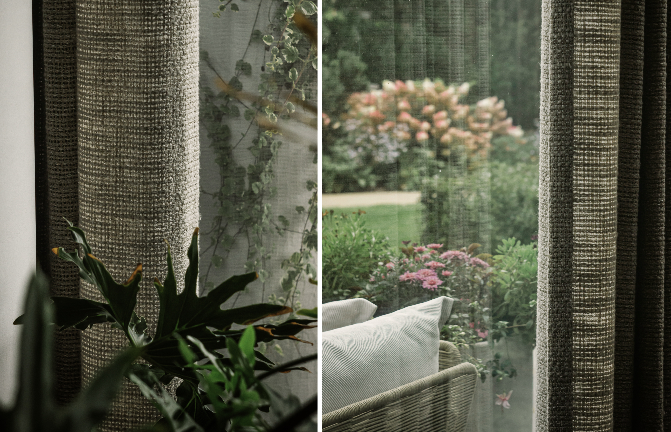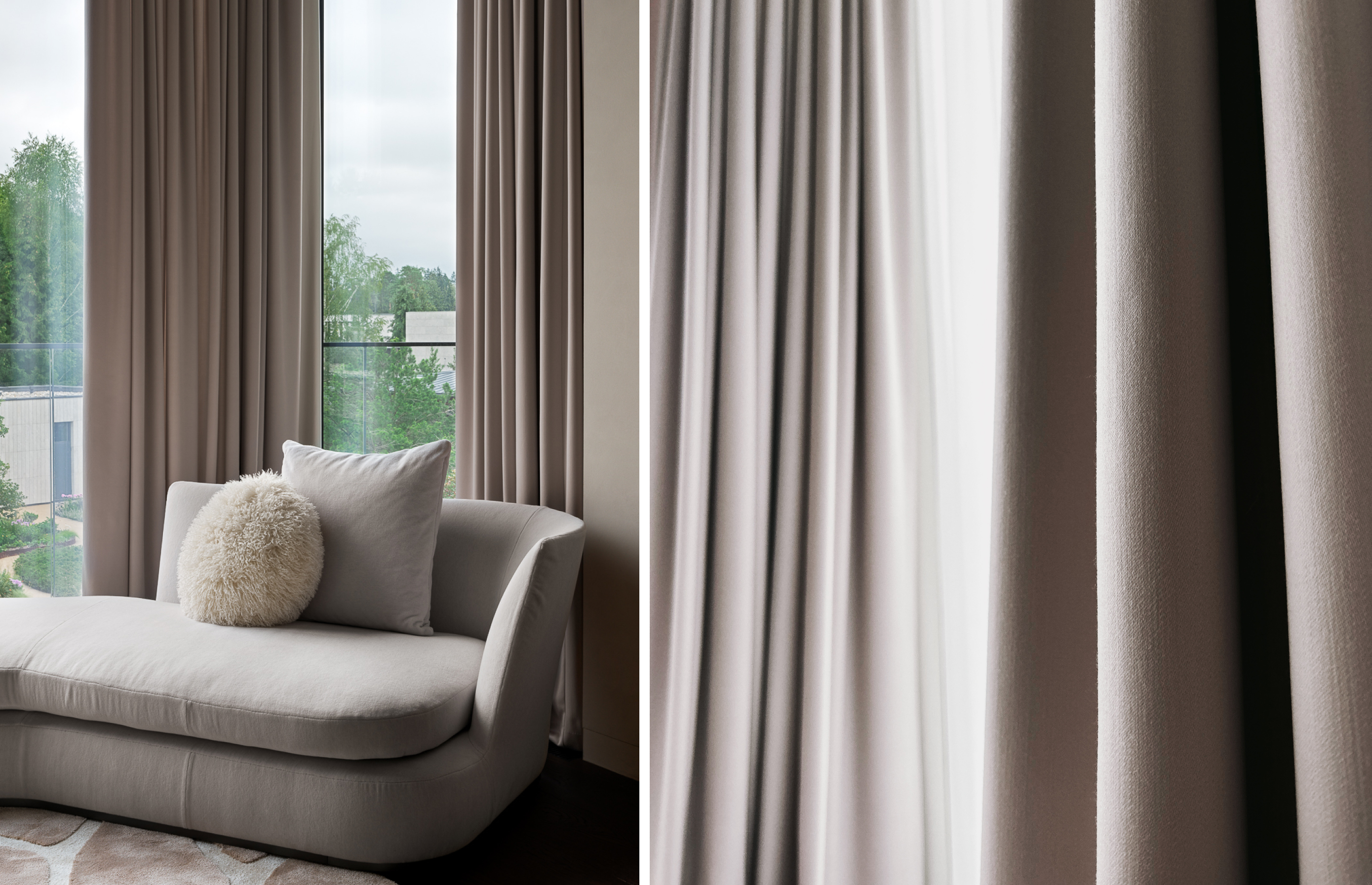 Каждое изделие разработано с учётом архитектурного ритма и световых сценариев помещения. Все портьеры дополнены рабочими портьерами из надёжного и плотного blackout-материала от Houlès, позволяющего регулировать освещение комнат даже при интенсивной активности солнца.