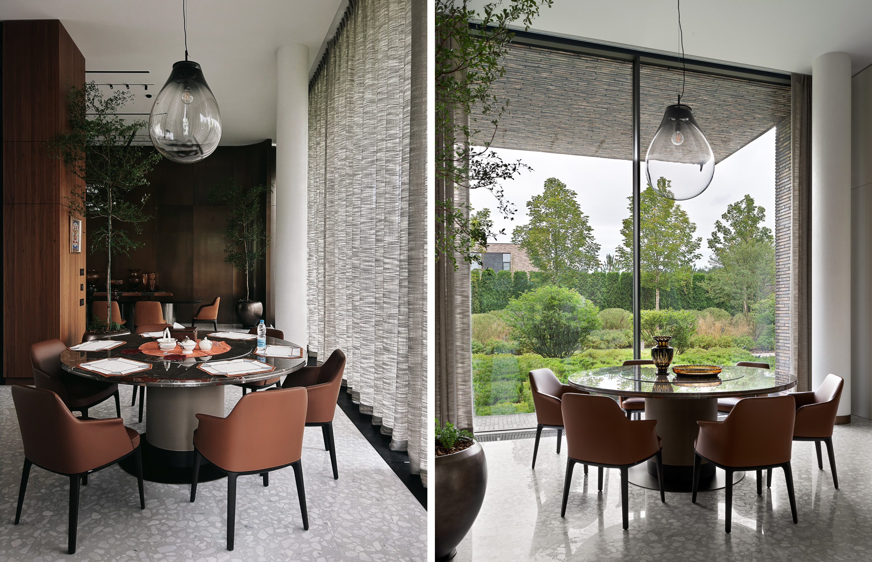В центральной зоне дома использованы фактурные льняно-шерстяные ткани Pierre Frey Sobeck. Высокие панорамные четырёхметровые окна оформлены облегчёнными портьерами, обеспечивающими равномерный мягкий световой рисунок и визуальную лёгкость и натуральность, подходящую для гостиной. Использованный коэффициент сборки 1:1,8 обеспечивает отличную посадку складок и приятный внешний вид. Портьеры выступили визуально связующими элементом между столовой зоной, гостиной и переходной зоной.