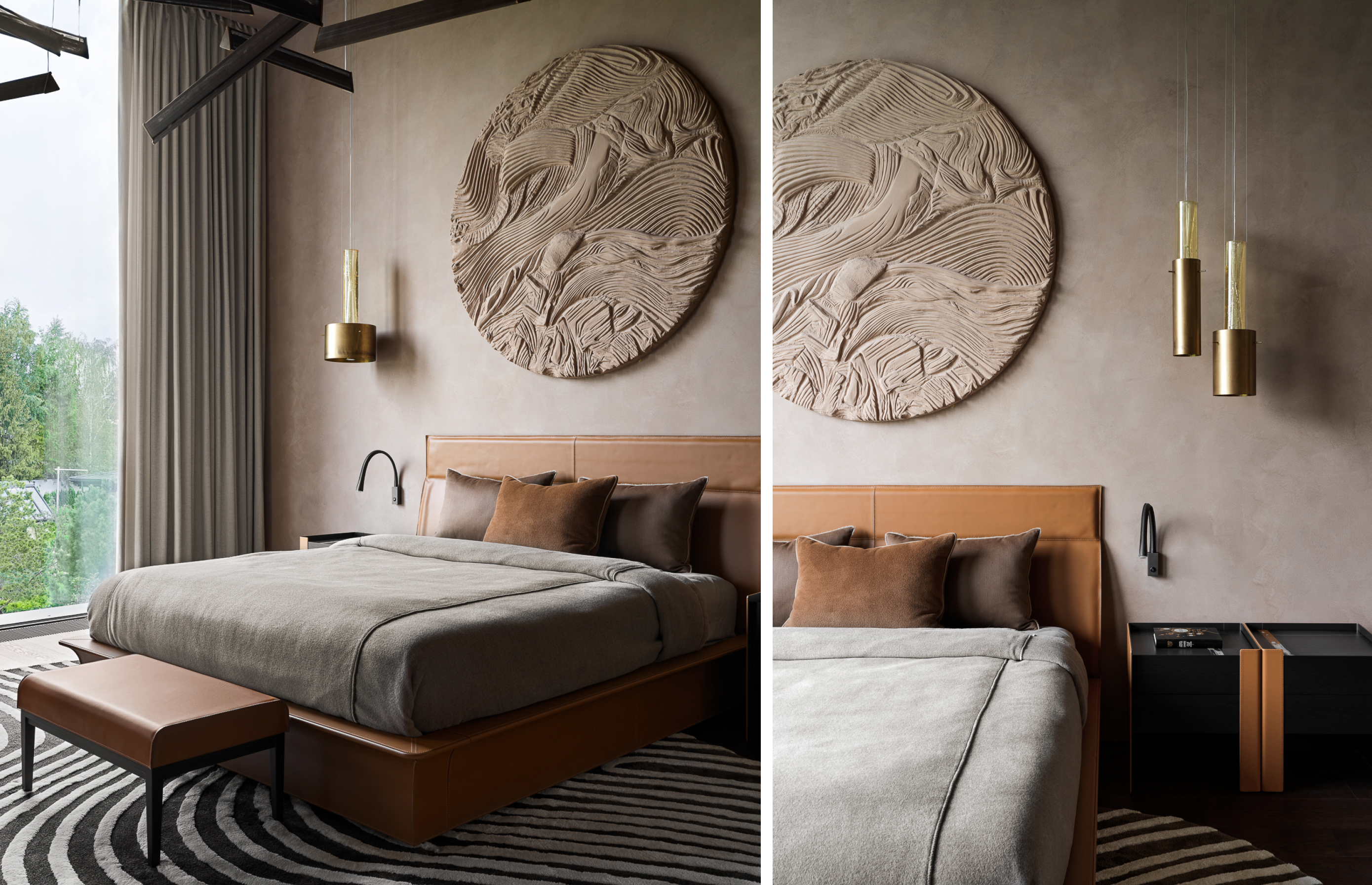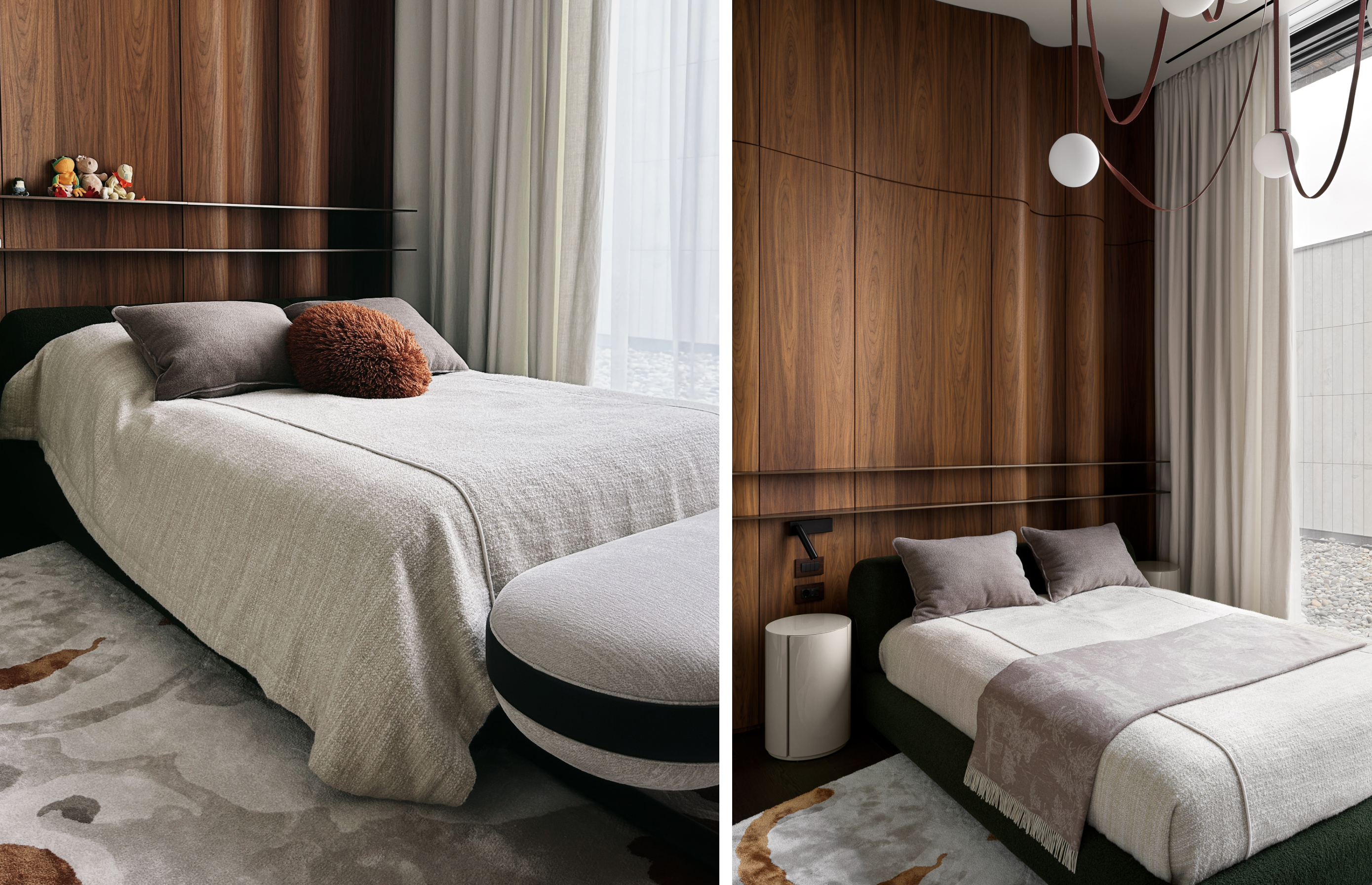 В каждой из трёх спален создана индивидуальная атмосфера, которая не выходит за рамки общей эстетики интерьера, но при этом подчёркивает характер своего хозяина: