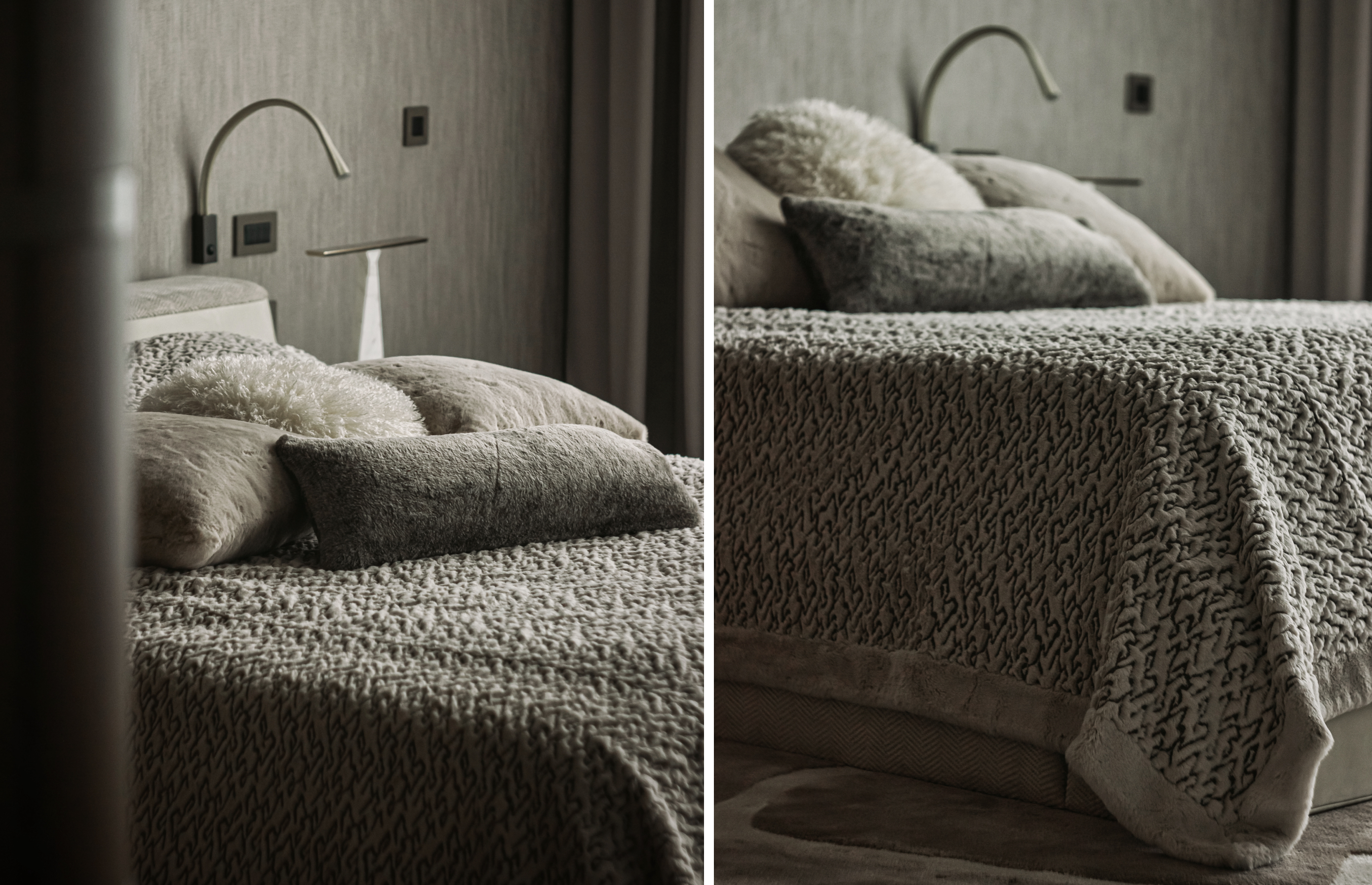 • Для среднего — практичная портьера из сочетания полиэстера и хлопка от Camengo, благородное молочное покрывало из альпаки и шерсти от Dedar и сет подушек из Misia и Dedar.
