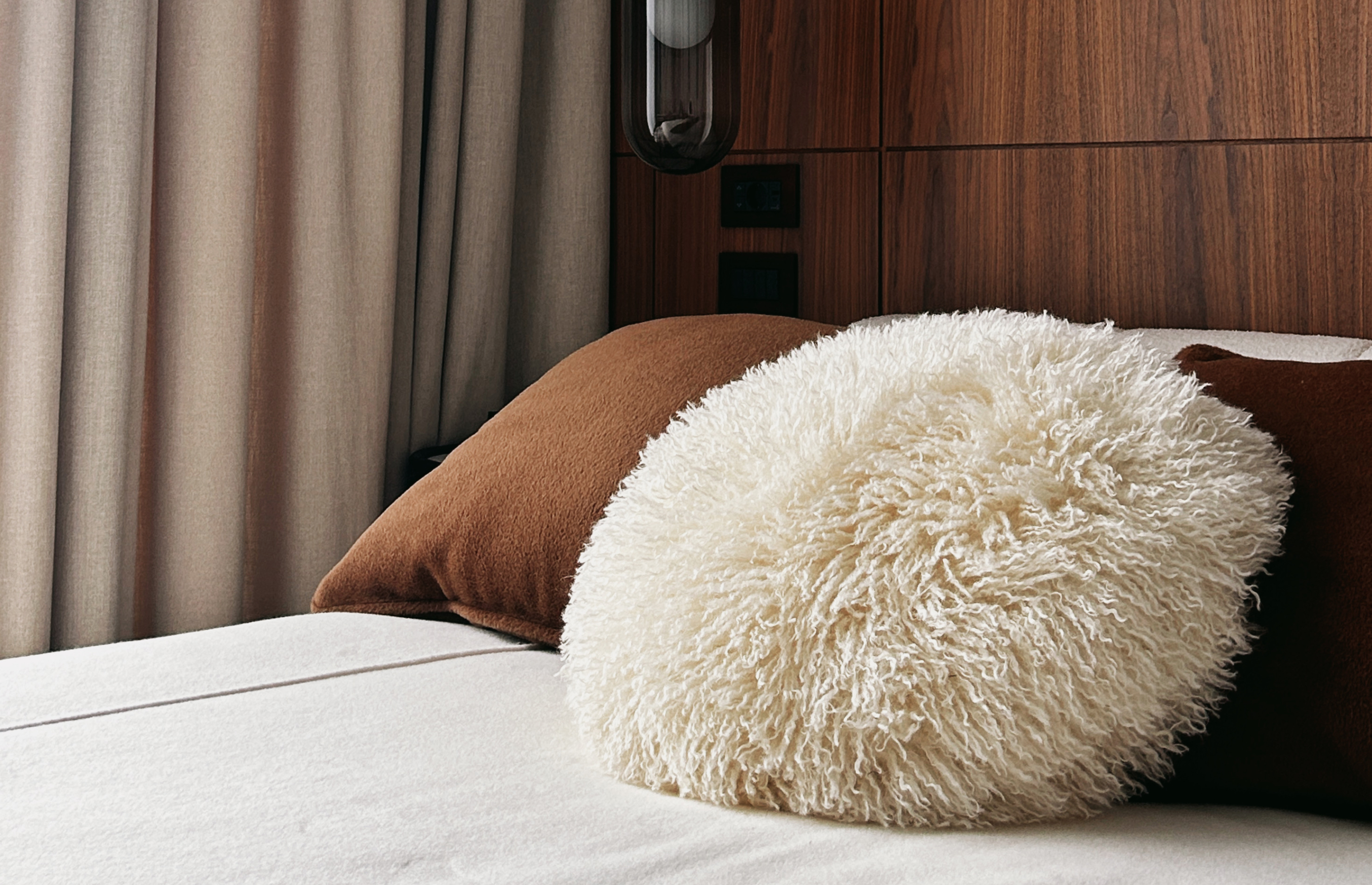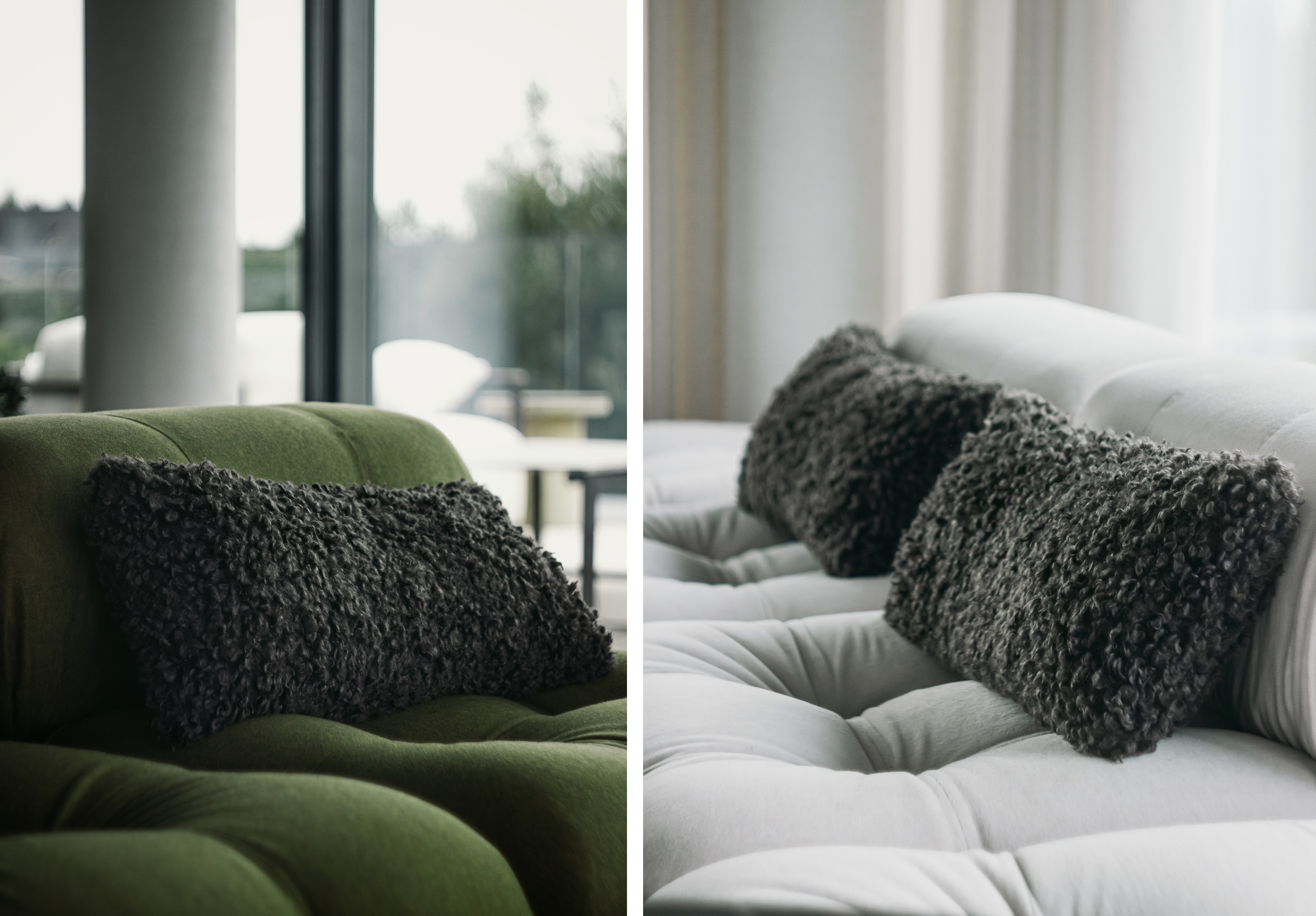 Для изготовления декоративных подушек на диванах была использована ткань из искусственного меха с имитацией овчины и подкладкой из вельбоа компании Fine. Она подчеркнула некую брутальность и не вышла за рамки сдержанной эстетики пространства.