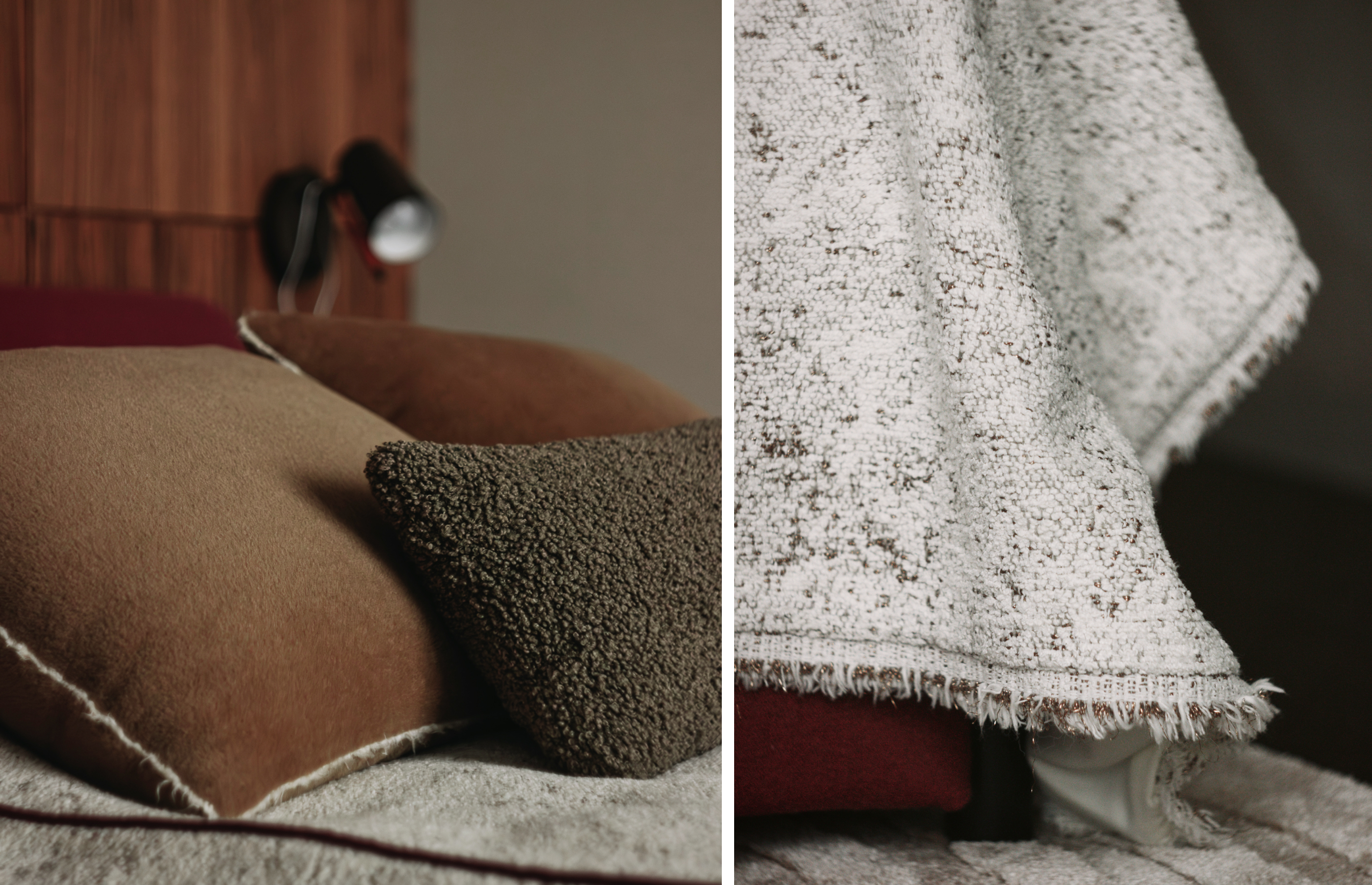 Использование материалов для подушек из одних и тех же коллекций в похожих оттенках позволило достичь стабильного ритма и устойчивой композиции во всём пространстве дома, где цветовые и фактурные решения подушек выступили связующим звеном и поддержали визуальную целостность.