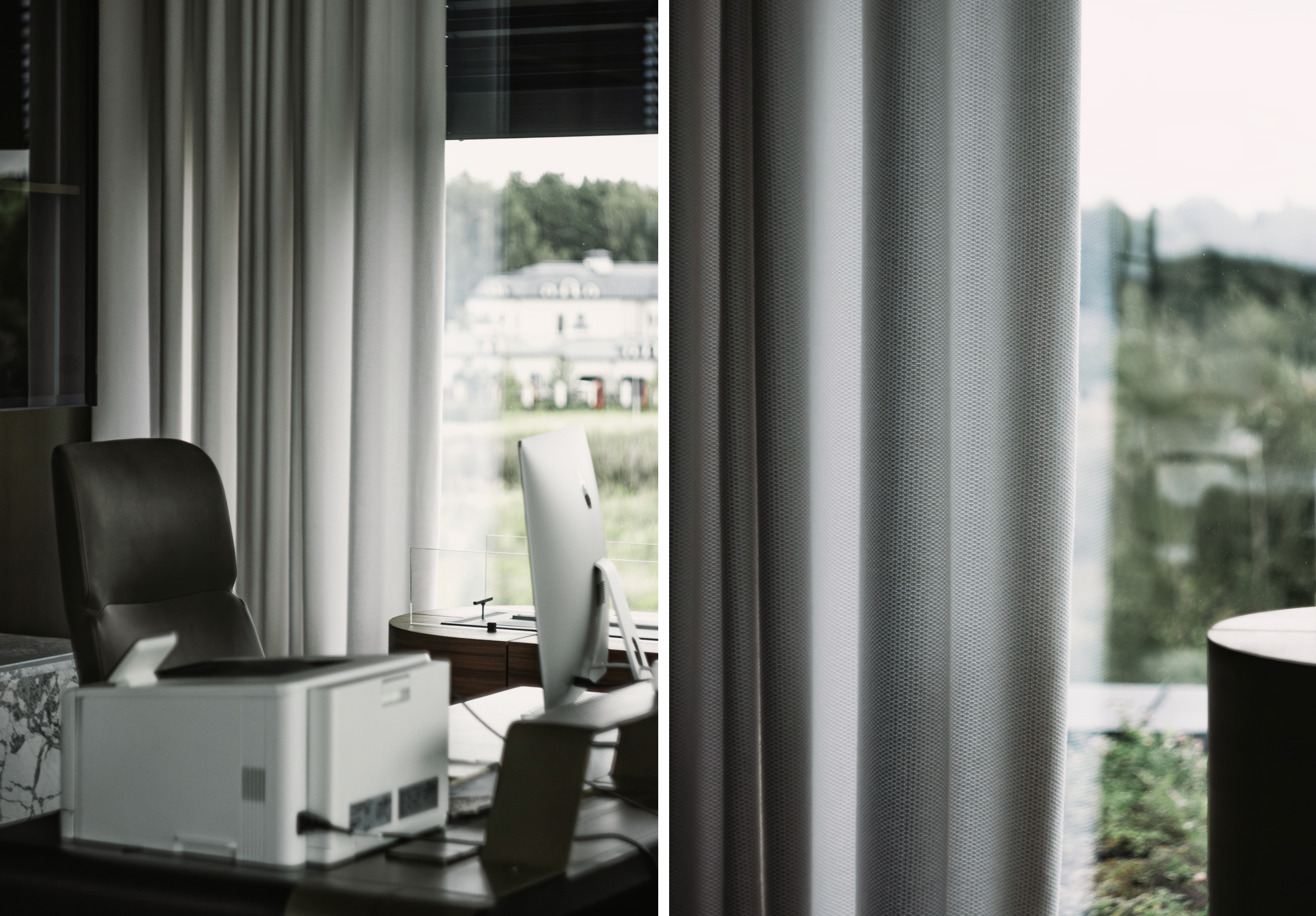 В рабочем кабинете установлены портьеры из фактурной ткани Pierre FreyOsiris, в составе которой хлопок и лён, для подкладки использован всё тот же рабочий белый blackout-материал AZUR от Houlès.