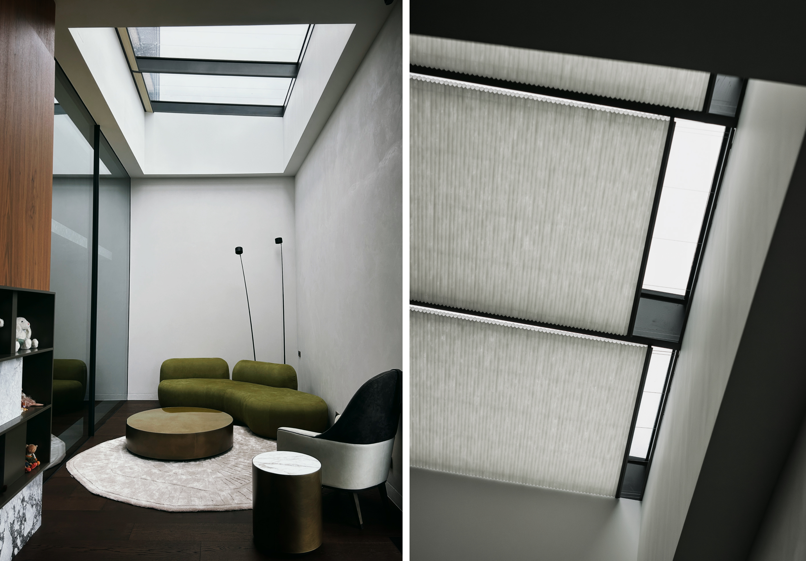 Плиссеэффективно защищают от солнечных лучей, при этом складчатая структура ткани мягко рассеивает свет, наполняя интерьер комфортным и сбалансированным освещением. В открытом состоянии система практически незаметна и сохраняет чистоту архитектурных линий окна. В проекте использовались плиссе немецкой компании MHZ: полотно 2,5 метра собирается в компактный пакет 6-7 см.