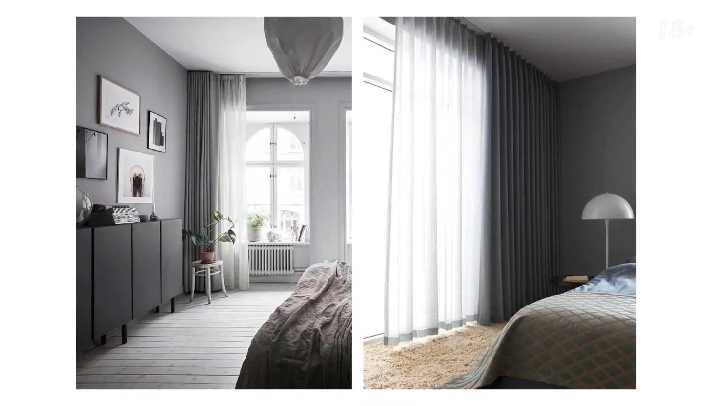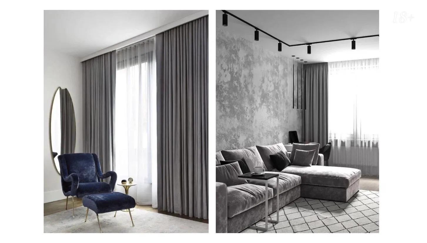 Здесь важно придерживаться одного правила — выбирать мягкие, хорошо драпирующиеся ткани. Портьерные шторы должны формировать аккуратные, частые складочки. Это то, что нужно для низких потолков. Если использовать жёсткие материалы, складки получатся широкими и массивными, что сделает шторы объемными и непропорциональными к невысокому потолку. А еще такие шторы съедают пространство и часто выглядят неаккуратно.
