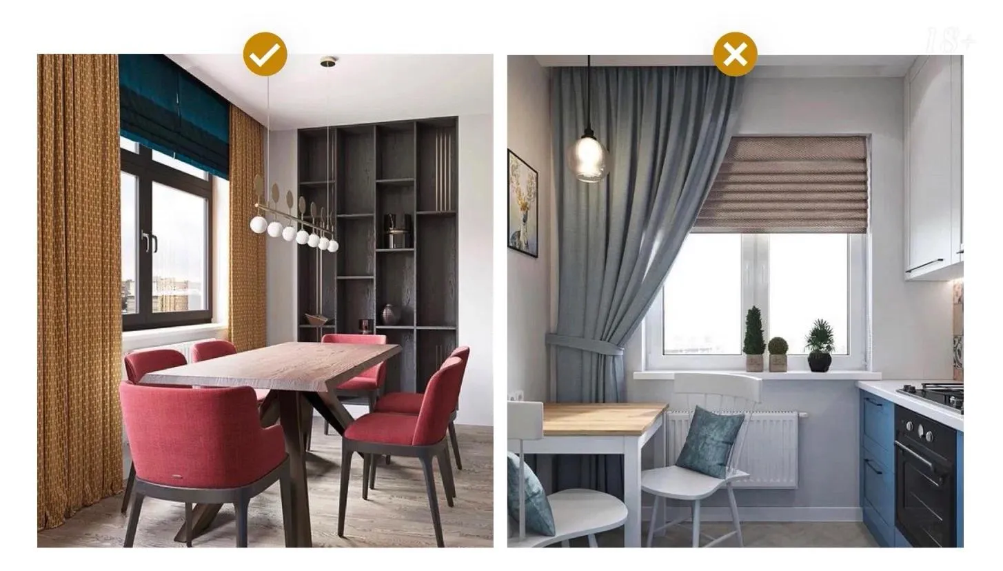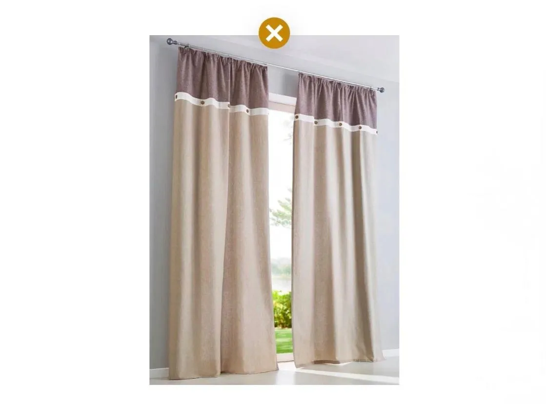 Даже при стандартных трехметровых потолках, квартиру можно визуально уменьшить в высоту, если пренебрегать общими правилами по выбору штор. Типичные ошибки: