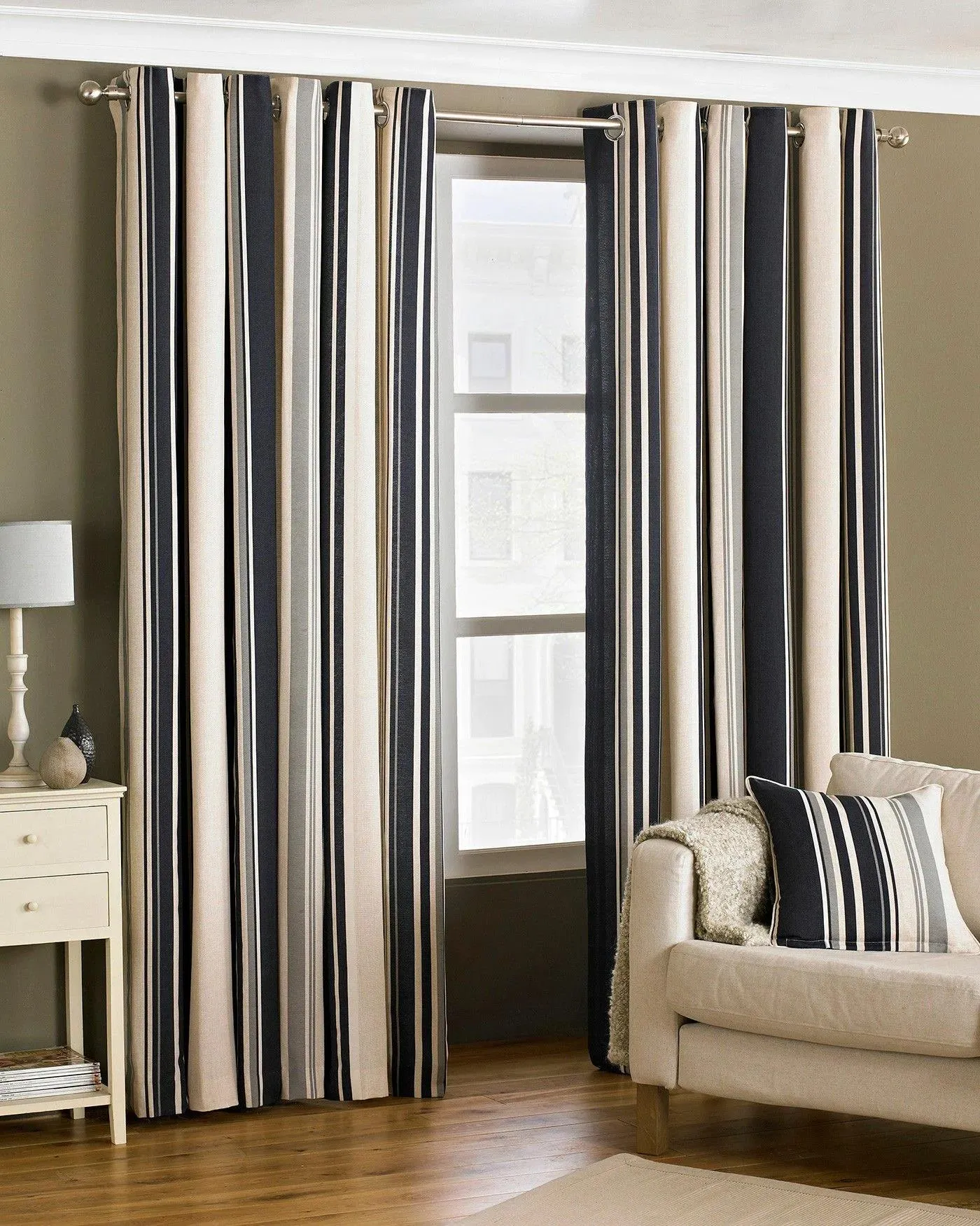 Хороший вариант для низких потолков — полосатые ткани, тут мы говорим про вертикальную полоску. Но здесь есть свои правила выбора. Размер полосы должен быть пропорционален ширине и высоте шторы. Ни в коем случае нельзя использовать ткани с мелкой полоской. Потому что, в массе она пропадет и портьеры будут смотреться просто однотонными. Можно использовать полосатые просветы, достигается это чередованием тканей разной плотности, например льняных. В категорию полосатых тканей входят шторы с вертикальными принтами и однотонной вышивкой.