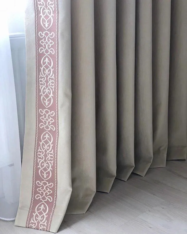 К однотонным тканям можно добавить к ним вертикальные полосы, одну или несколько. Они вытянут портьеры, а заодно создадут нужные акценты и сочетания. Мы говорим про использование декоративных бордюров. Их очень много, разных по дизайну и по ширине. Выбрать подходящий вариант не составит труда.